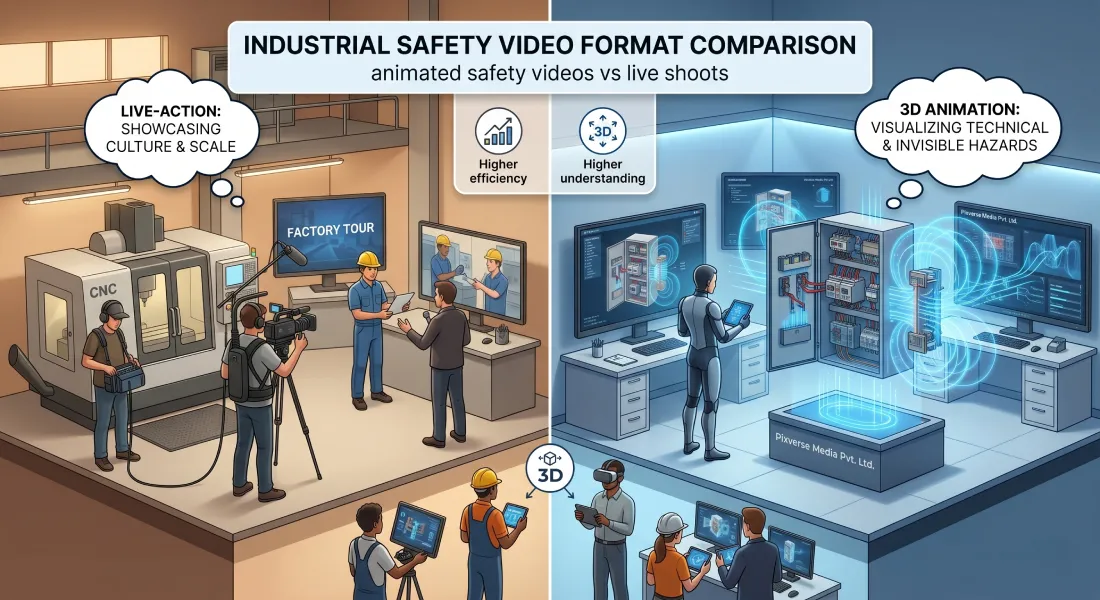 At Pixverse Media Pvt. Ltd., we operate as Video Engineers, crafting ultra-minimalist, high-fidelity visual solutions for the B2B and industrial sectors. We understand the precise requirements of heavy engineering training. In this comprehensive industrial training format comparison, we will break down exactly why and when animated safety videos vs live shoots yield higher training efficiency, better scalability, and a safer workplace.